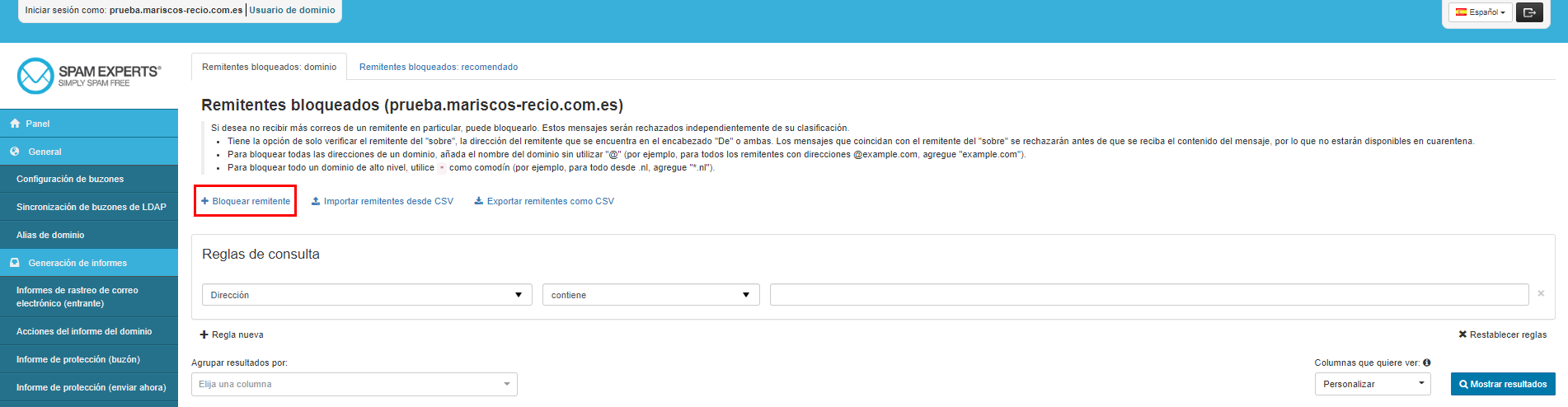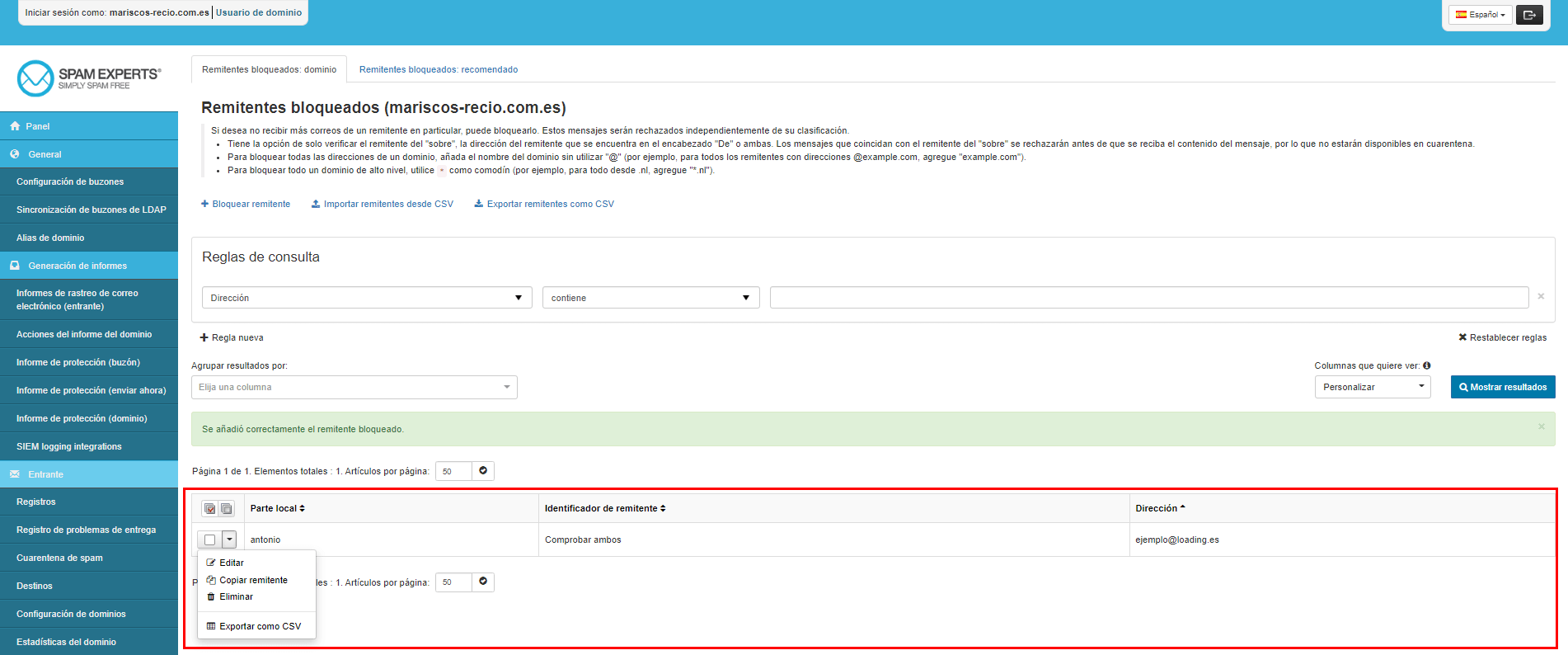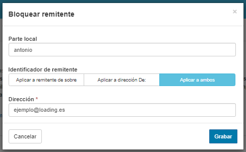 Por si no queda del todo claro, en este ejemplo, hemos indicado que el usuario antonio@prueba.mariscos-recio.com.es NO desea recibir correos de la dirección ejemplo@loading.es. Y, si quisiéramos indicar que todas las cuentas de correo del dominio mariscos-recio.com.es desean bloquear a ese remitente, el campo Parte local, lo dejaríamos en blanco.