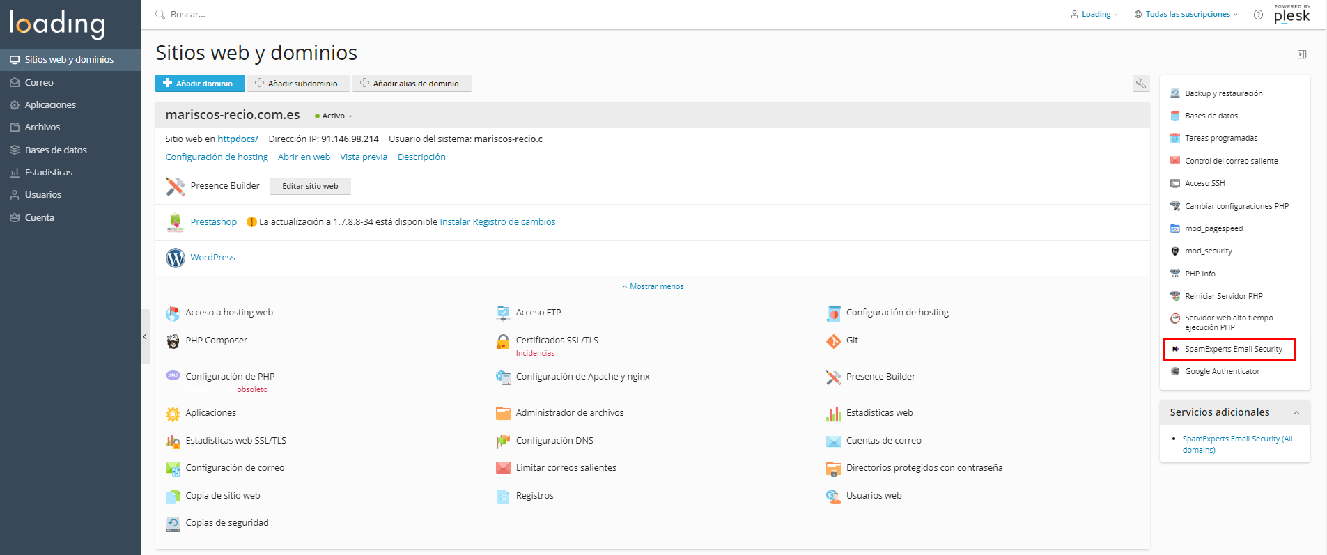 - Accede al panel de control de Plesk y, en la página principal Sitios web y dominios, dirígete al menú de la derecha y haz clic en SpamExperts Email Security.