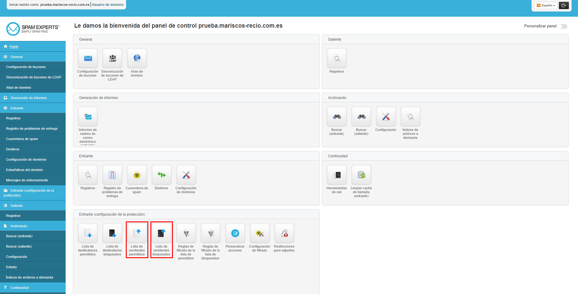 - Una vez dentro del panel de control de SpamExperts, haciendo scroll, encontrarás la sección Entrante (configuración de la protección).